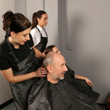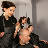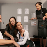 Dave has gone for a quick trim but when he sees how gorgeous the hairdressers are he gets a stirring in his pants. When Vinna bends over in front of him and he sees her white panties he can't help but unzip and start playing with himself under the gown. Unfortunately for him, stylist Tindra notices and whips the gown off to expose him. She is horrified but the other two girls love the sight of his cock! They start jerking him off and Tindra has to watch as he shoots his load!